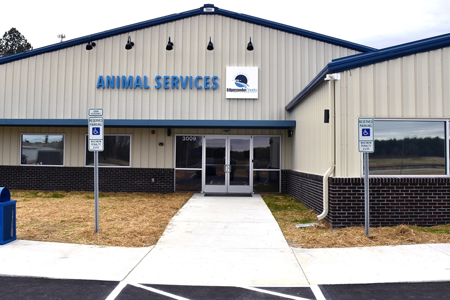 The Edgecombe County Animal Shelter located in Tarboro, North Carolina, serves as the primary animal care center for the county. The facility includes administrative offices, a public lobby, and can house up to 60 dogs and 40 cats. This design included a pre-engineered metal building with high-performance interior finishes, LVT flooring in public and office areas, and epoxy flooring in housing for ease of cleaning and durability. The result is a safe, efficient, and resilient facility supporting county operations.